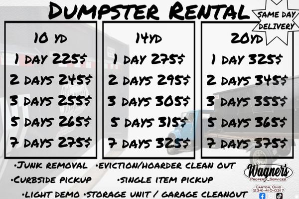 We offer 10yd, 14yd, and 20yd roll-off dumpsters with flexible time frames offering 1,2,3,5, and 7 day rentals. We also offer discounts on back-to-back rentals if bigger than we offers needed also willing to work with you on longer rentals if need be. Don’t Hesitate to reach out today.