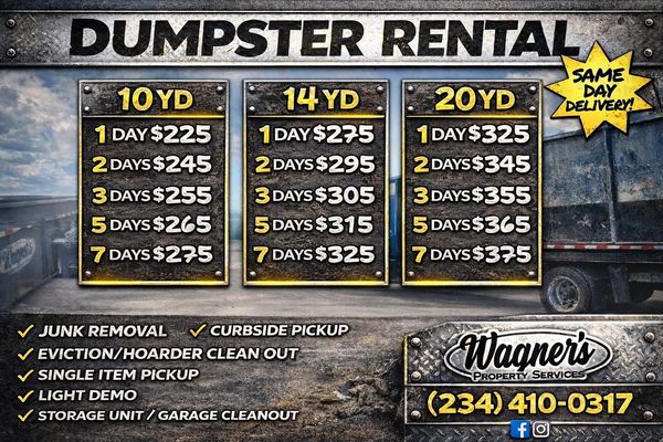 We offer 10yd, 14yd, and 20yd roll-off dumpsters with flexible time frames offering 1,2,3,5, and 7 day rentals. We also offer discounts on back-to-back rentals if bigger than we offers needed also willing to work with you on longer rentals if need be. Don’t Hesitate to reach out today.